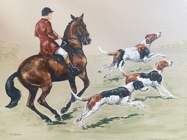 ‘ Fresh’ depicts an enthusiastic horse and accompanying hounds raring to gallop across an open field. This painting revisits the timeless appeal of the hunting scene in art. The horse is ready to leap off at any moment if given a free rein.